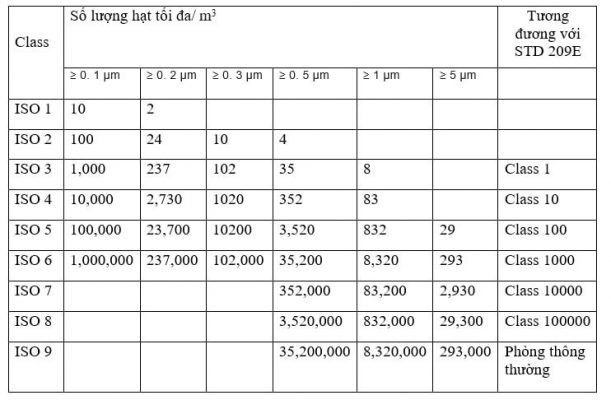 Số lượng các hạt cho phép khi kiểm tra cấp độ sạch của phòng sạch